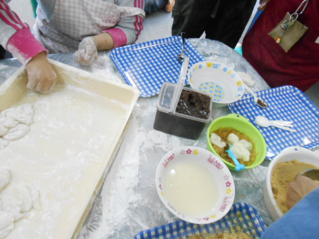 みんなで頑張ってついたお餅は丸く整え、あんこや大根おろし、