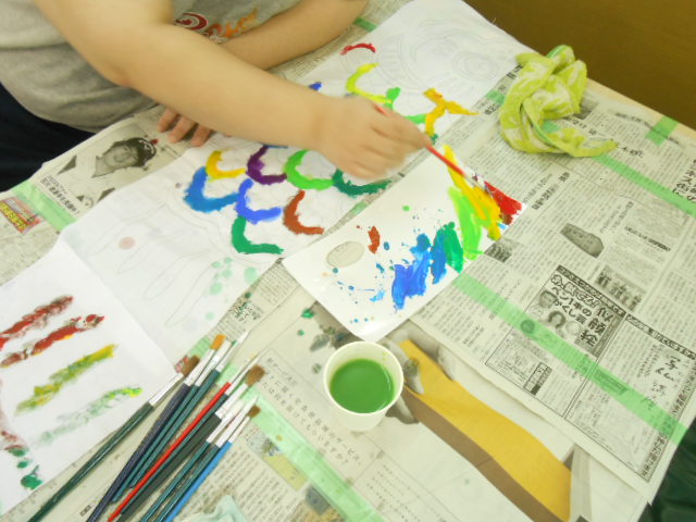 糸島から先生に来て頂いて、こいのぼりが下書きしてある布に、