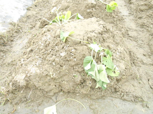 肥料を入れ、うねを作り、利用者の方たちと紅あずま・金時の2種類を植えています!