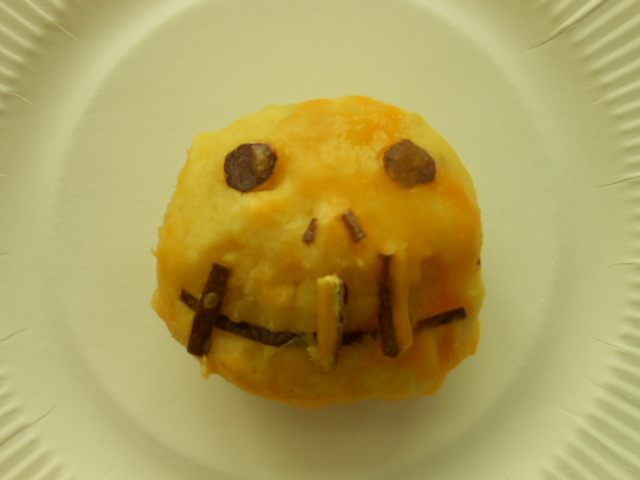 芋のペーストにアイスクリームを入れて混ぜ、ラップに包んで丸めて顔を付けています。この顔はサツマイモの皮を使いました♪